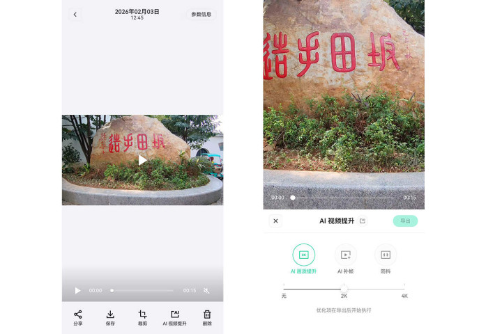 夸克AI眼镜APP内部提供了AI视频提升功能,可以提升画质、补帧和进一步提升防抖,优化后画质、流畅度、稳定性提升明显,能够更好的满足社交平台分享的需求。