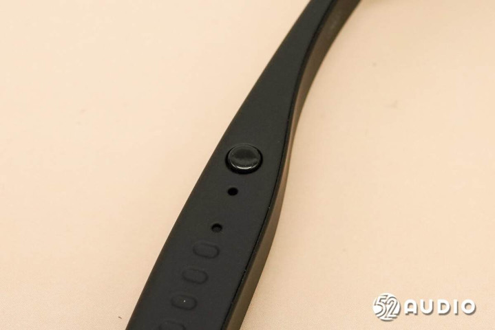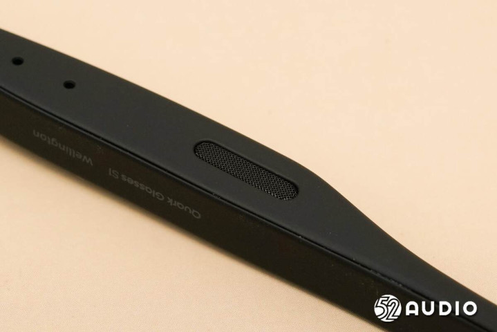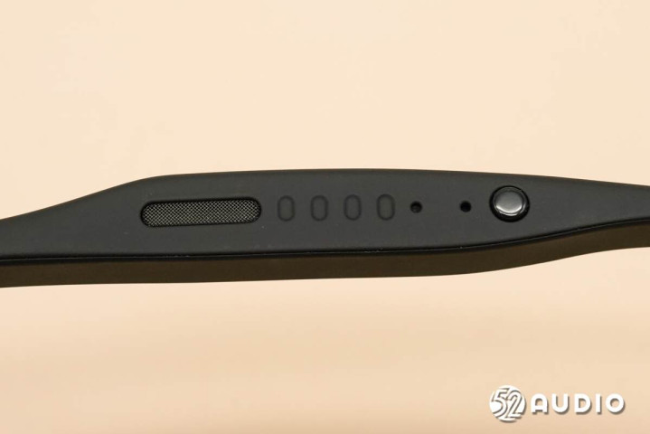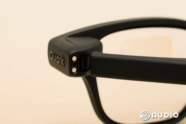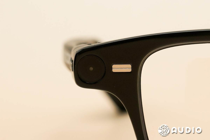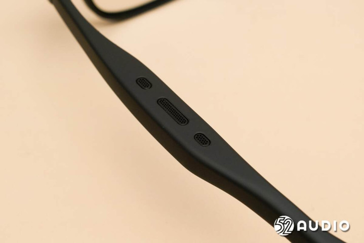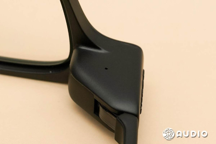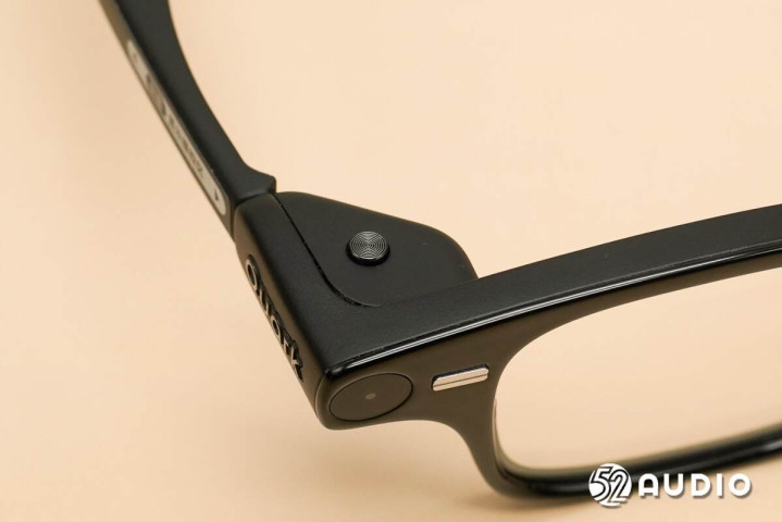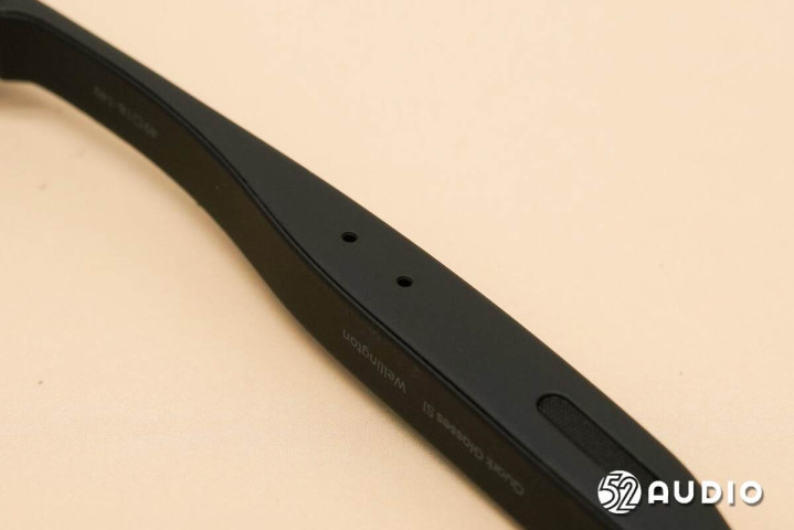 镜腿底部的麦克风拾音孔特写。左右镜腿麦克风对称式设计,搭配镜框的骨传导麦克风,总共5单元拾音。