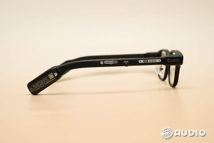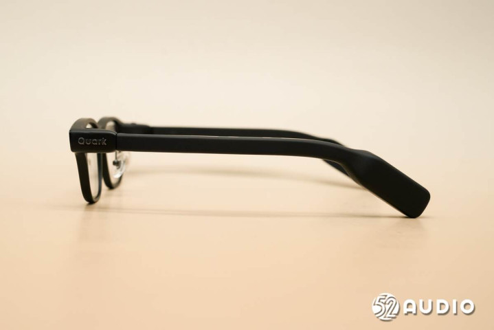 机身左侧外观一览。从侧边看,夸克AI眼镜S1的镜腿可以说一改其他品牌产品的宽大形象,非常纤细,宽度仅7.5mm。同时采用了6.5°前倾角镜框设计,10°镜腿外张角设计,以及前后1:1均衡配重设计,来提升佩戴舒适性。