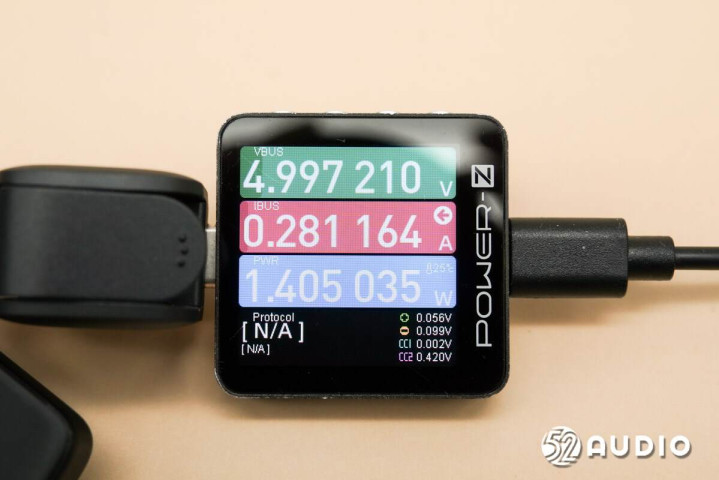 在充电方面,我爱音频网采用专业测试仪CHARGERLAB POWER-Z对夸克AI眼镜S1进行充电测试,测得该眼镜的有线充电电压电流约为5.00V 0.28A,功率约为1.41W。
