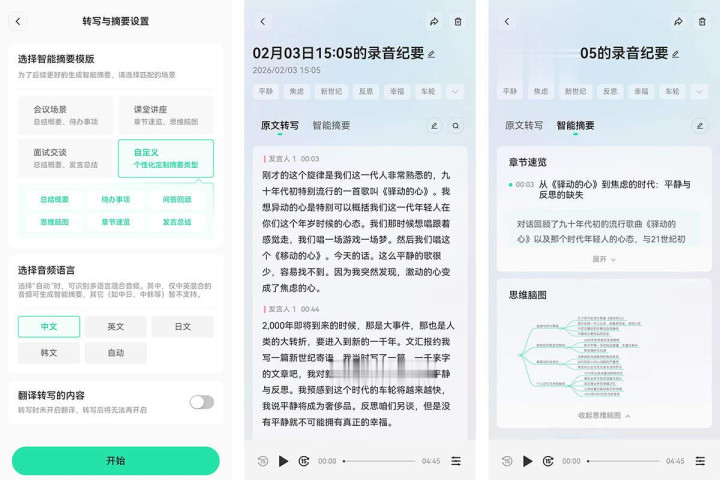 录音纪要支持全向拾音和前向拾音两种模式,支持会议场景、课堂讲座、面试会谈和自定义4种智能摘要模版,支持中英日韩4种语言和中英混合音频。原文转写内容精准,且支持同步翻译。智能摘要可生成章节速览、总结概要、待办事项、问答回顾、思维导图和发言总结,能够帮助用户高效处理录音内容。