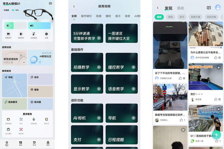 夸克AI眼镜S1配备「夸克AI眼镜」手机APP,下载后根据提示可快速与眼镜配对。配对成功后,可在APP内进行各项功能的预设,导入和查看眼镜拍摄的照片和视频,以及查看与随身超级AI助理的所有对话内容记录。还有AI眼镜社区,方便用户进行分享交流。