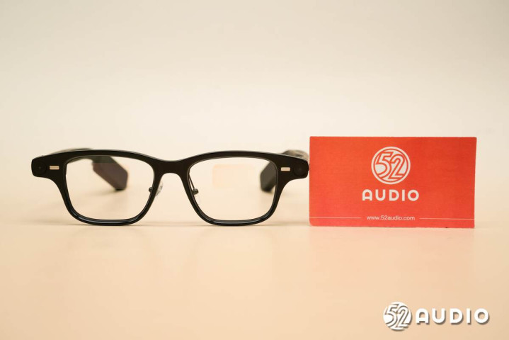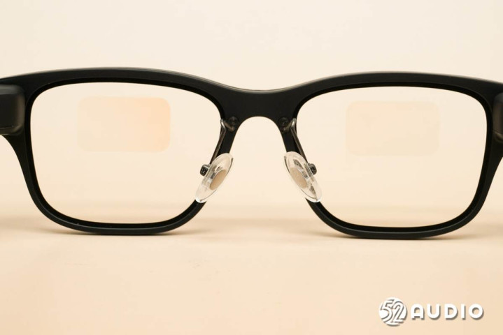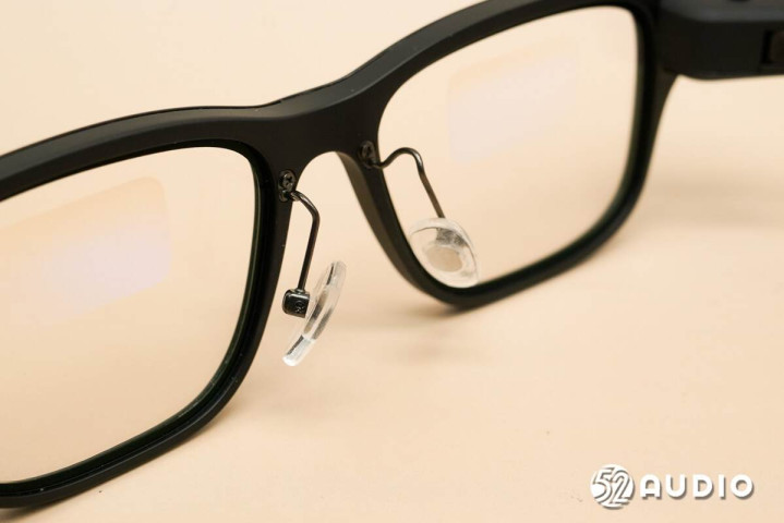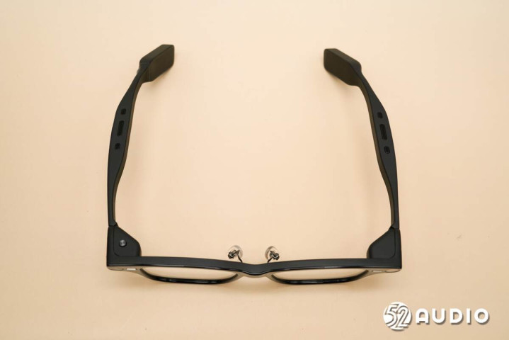 从顶部可以看出镜腿设计的巧思。相较于其他产品,其通过将内部元器件横向布置,虽然提升了厚度,但有效降低了镜腿宽度,提升了美观度。