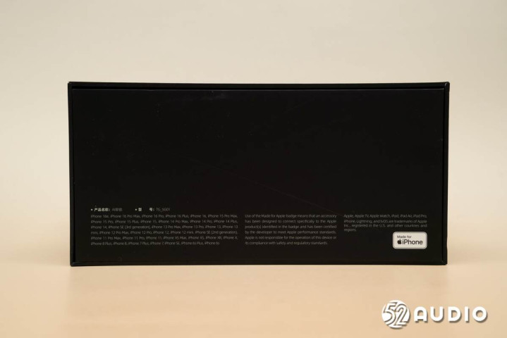 包装盒底部介绍了产品名称和型号信息,以及Made for iPhone标志和兼容的iPhone产品。