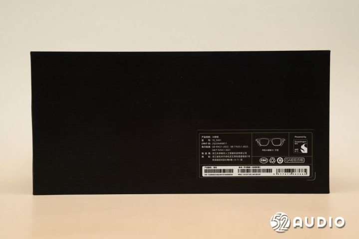 包装盒背部贴有产品标签,产品名称:AI眼镜,型号:TG_5G01,制造商:浙江未来精灵人工智能科技有限公司。产品颜色:黑色,版本:平光镜版(标准套装),以及第一代骁龙AR1平台标志。