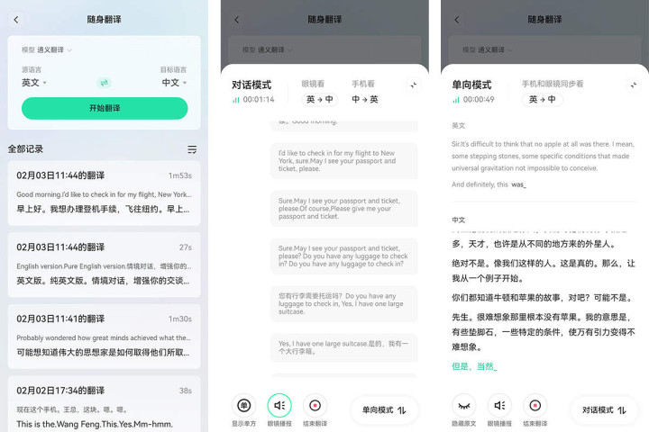 随身翻译基于千问大模型,支持高达89种语言互译,支持单向模式和对话模式,支持屏幕实时显示原文和翻译内容,支持语音播报。其中,单向模式主要用于会议报告、演讲、听课等单方面的讲话场景,对话模式则用于双方交流。
