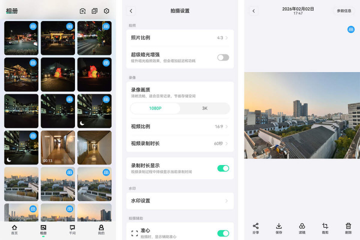 拍摄的内容,通过APP内的相册可以导入手机,并可进行初步的裁剪,以及添加预设的十余种滤镜,然后可以保存到手机,或分享到AI眼镜社区、微信好友、朋友圈等社交软件。